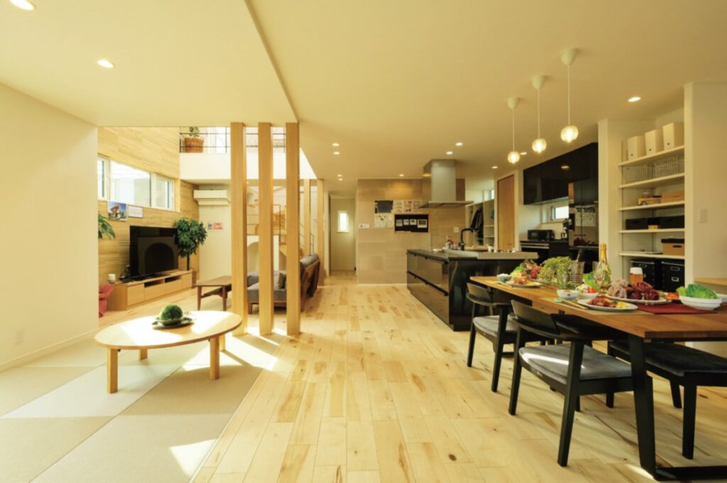 福山店モデルハウスでは、エアコン1台でLDK全体が暖かく保てるように設計されています。ご来場いただいたお客様からは「玄関に入った瞬間に暖かい」「部屋ごとの温度差が少ない」と驚かれることも多く、これこそ断熱性能の高さを示すポイントです。